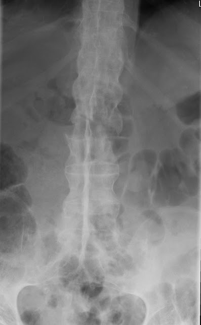 Chalk stick fracture with superior t12 endplate avulsion. Chalk stick fractures are fractures of the fused spine, classically seen in ankylosing spondylitis.
