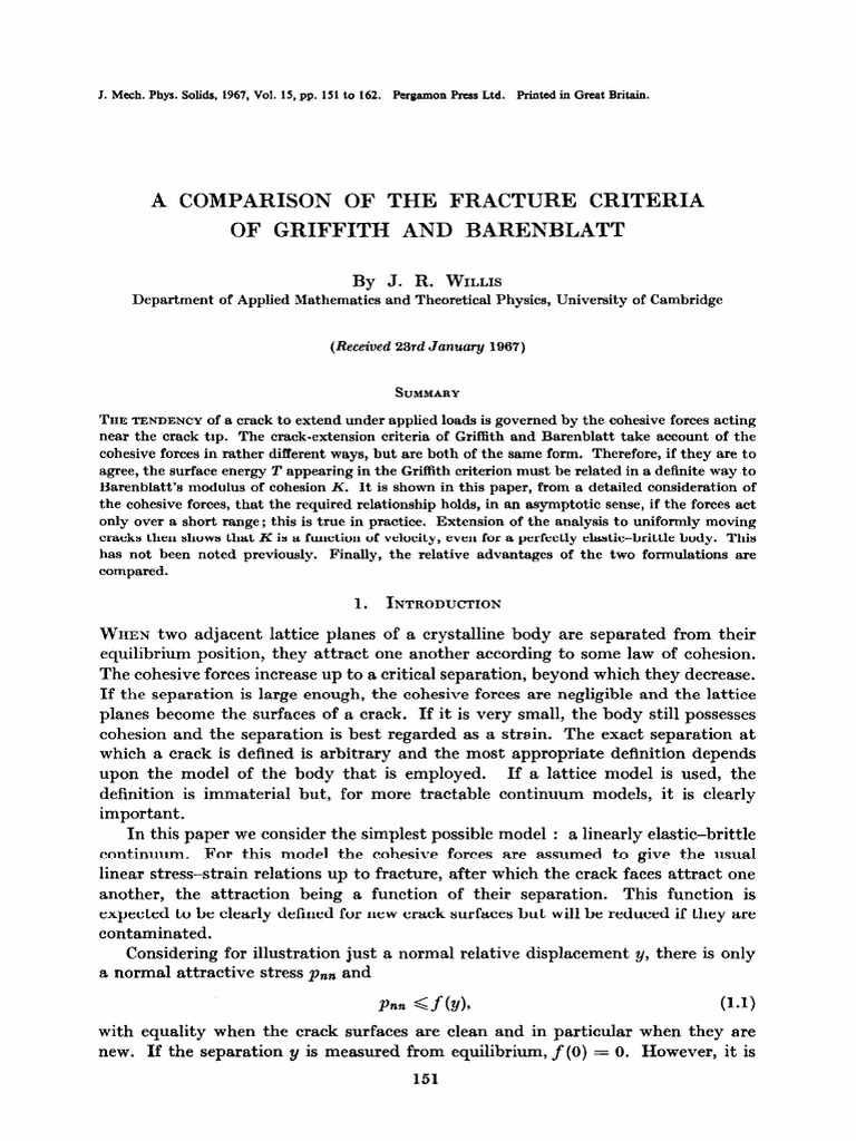 The main puzzle had been that. Mechanism of brittle rock fracture: However, neither of these criteria. Fracture, theory, toughness, griffith, fracture toughness, griffith theory of. In a paper published in 1920 1, a a griffith laid the foundations of fracture mechanics with his criterion for brittle fracture: At the expense of a slight departure from the classical theory, the new formulation decisively addresses three major issues: Propagates rapidly without increase in applied stress. You've reached the end of your free preview. I am talking about this expression derivation σ=(2eγ/(1−ν2)cπ)1/2. The rest of the body remains elastic. Fracture of brittle materials can occur under compressive loading also. N basics of fracture mechanics. Griffith proposed that a brittle material contains a population of fine small cracks and flaws that have a variety of sizes , geometries and orientation which produces a stress concentration of sufficient magnitude so that the theoretical cohesive strength is. Brittle fracture is often caused by low temperatures. A) sketch curves showing how the changes in surface energy required, and potential energy. 7/29/2019 griffith theory of brittle fracture. The griffith theory of brittle failure provides a simplified model and a useful basis for discussion of this process.